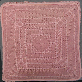 My second favorite is Saxony, a marvel stitched on 10-mesh canvas. It works up so quickly, you cannot believe it. Somehow, the original ecru version has disappeared from Needle Nicely, but I still have two other models. One is in pink to show its versatility. The other is in tan with watercolors substituted for the perle cotton accents. Definitely a quick stitch, and so satisfying.